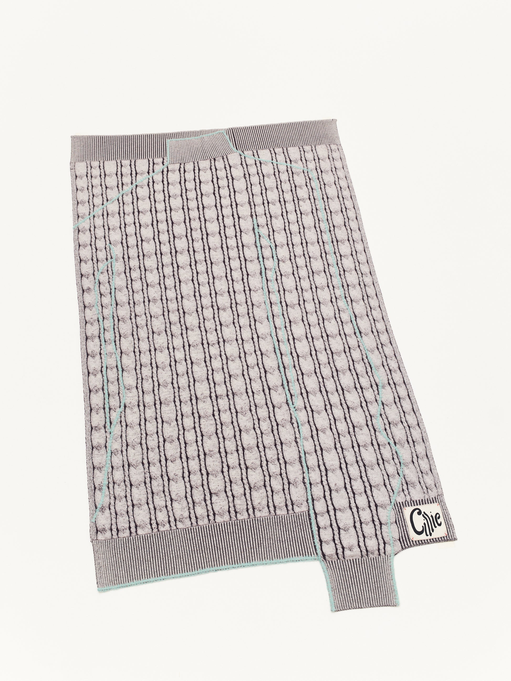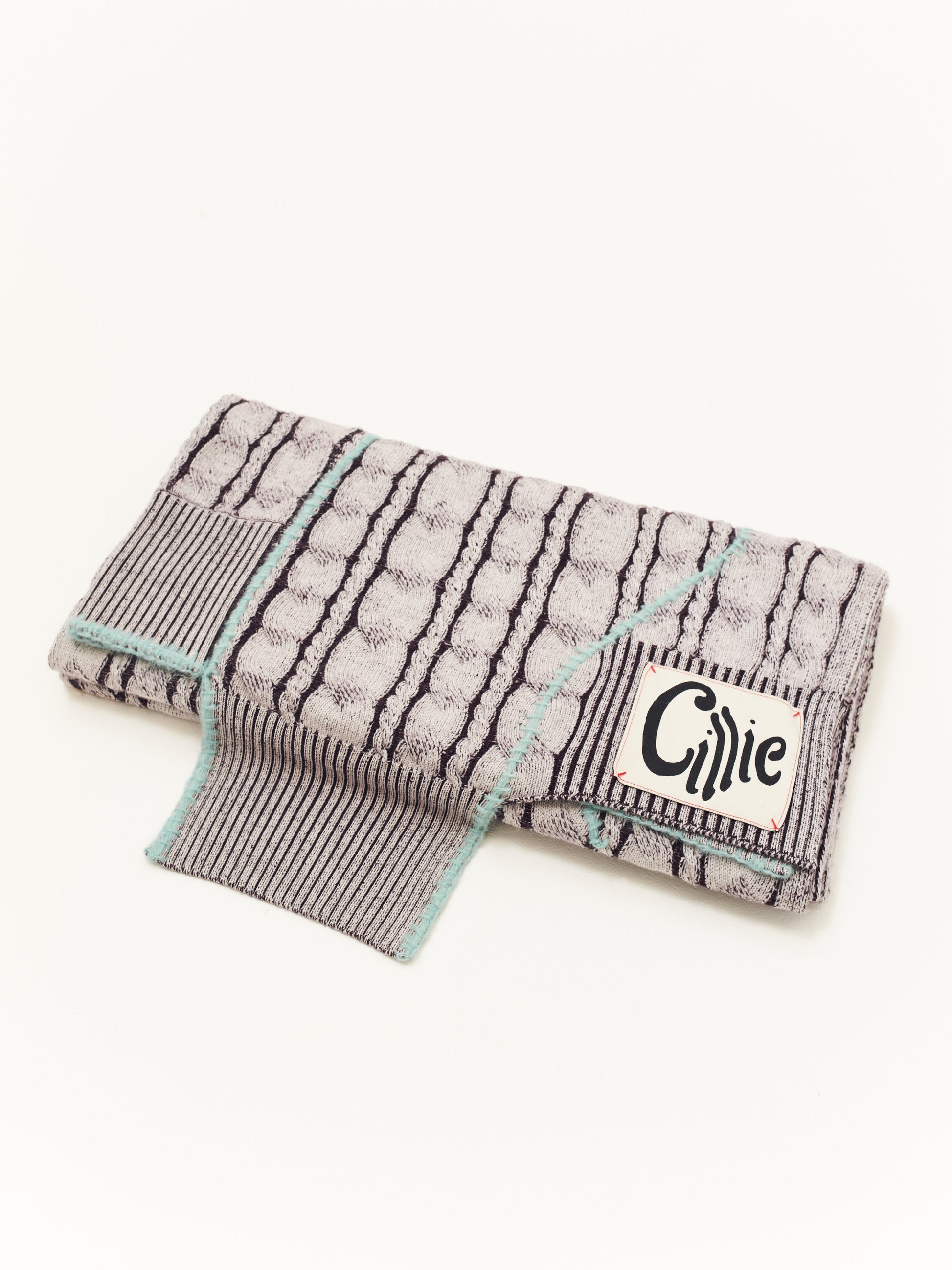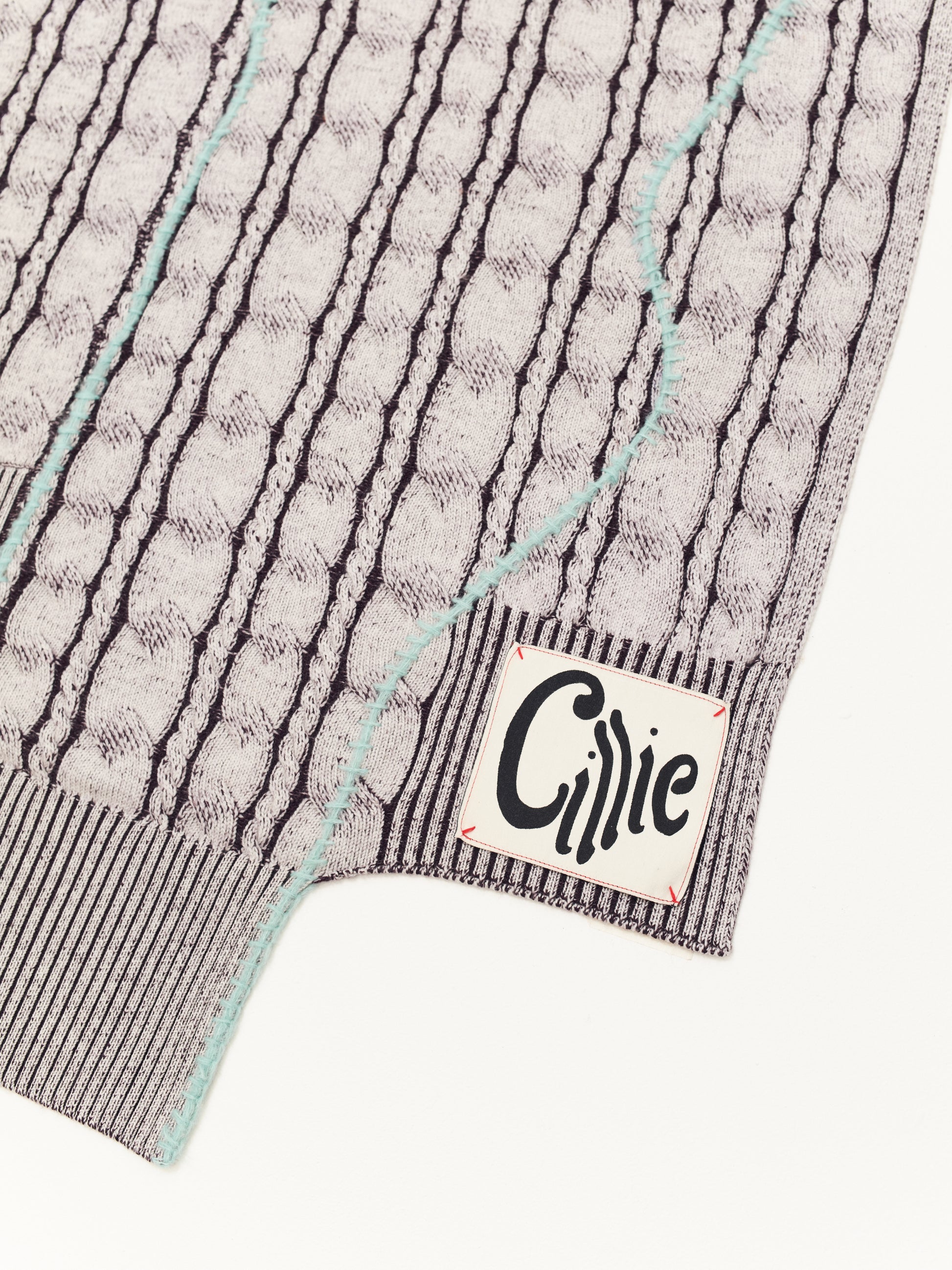 Featuring hand embroidered mohair, a two tone twisted cable and a rib steps to create this unique piece.
